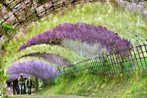 ในขณะที่ดอกซากุระเริ่มเบ่งบาน ดอกเวสทีเรียหรือที่เรียกกันว่าดอกฟุจิ ก็กำลังแข่งขันกันออกดอกบานสะพรั่งงดงามไม่แพ้กันค่ะ ในช่วงกลางเดือนเมษายน ภายในสวน Kawachi Fujien แห่งเมือง Kitakyushu ซึ่งเป็นอุโมงค์ Wisteria flowers ยาวกว่า 100 เมตร จะพร้อมใจกันออกดอกเป็นพวงห้อยย้อยลงมาจากอุโมงค์ ซึ่งสีม่วงอ่อน ม่วงเข้ม สีขาว สีชมพู เหล่านี้ก็จะทำเราเพลินตาเพลินใจไปกับการดื่มด่ำและสัมผัสธรรมชาติแบบลืมตัวลืมเวลากันเลยทีเดียวค่ะ